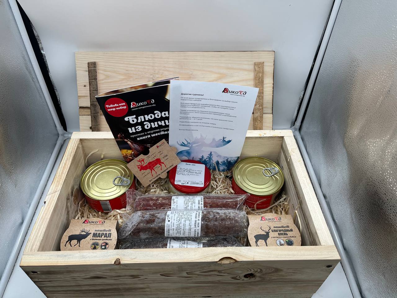Также вы можете добавить к заказу любые другие продукты из нашего магазина, и мы упакуем их в Дикий ящик дополнительно. Например, если вы хотите преподнести подарок на природе, на шашлыках, то можете добавить корейку кабана, или окорок лося. Тогда подарок можно будет сразу и приготовить, насладившись стейками из лосятины, или шашлыком из дикого кабана :)